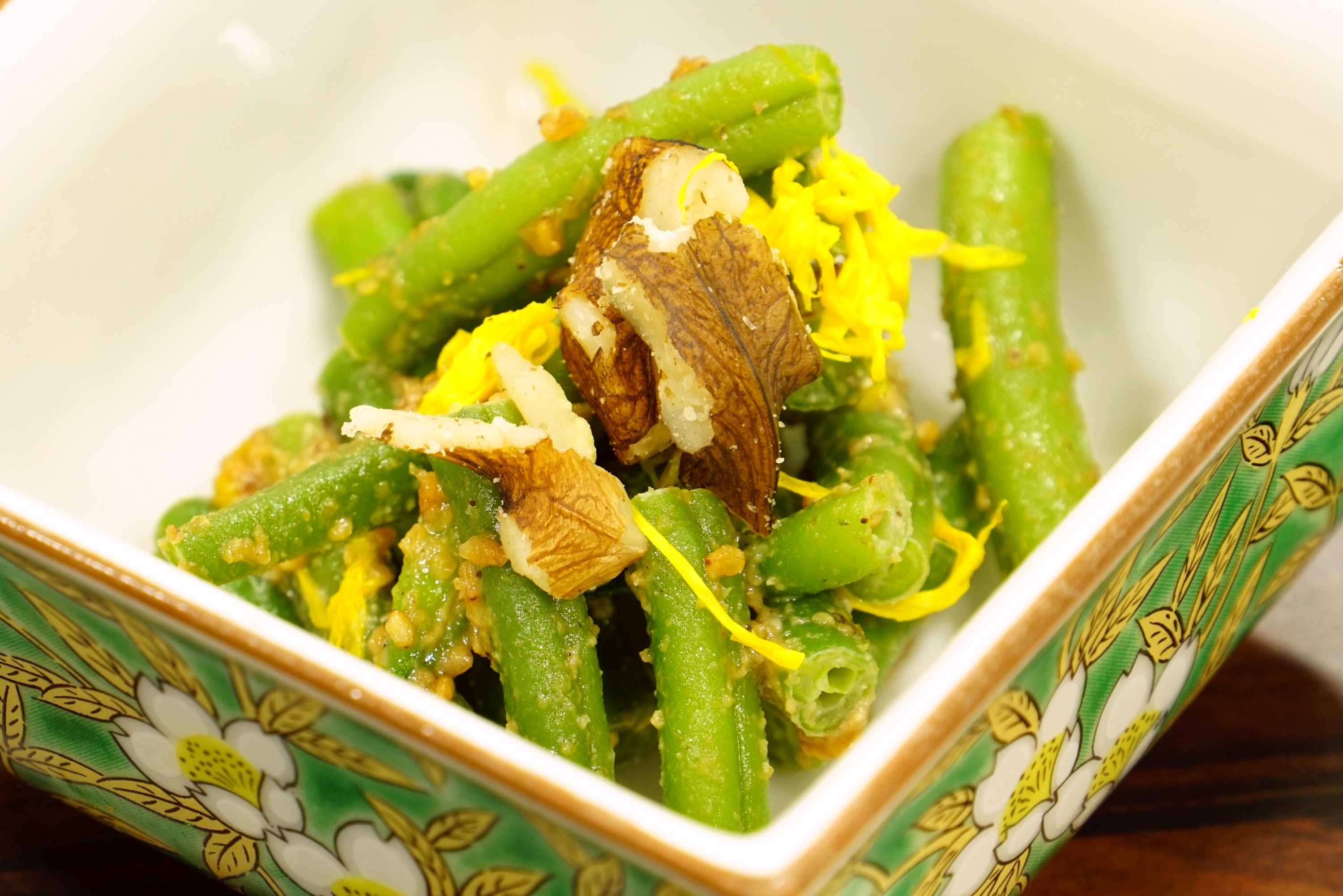 ・ ささげ(インゲン豆)と黄菊の胡麻胡桃味噌和え